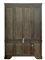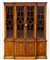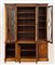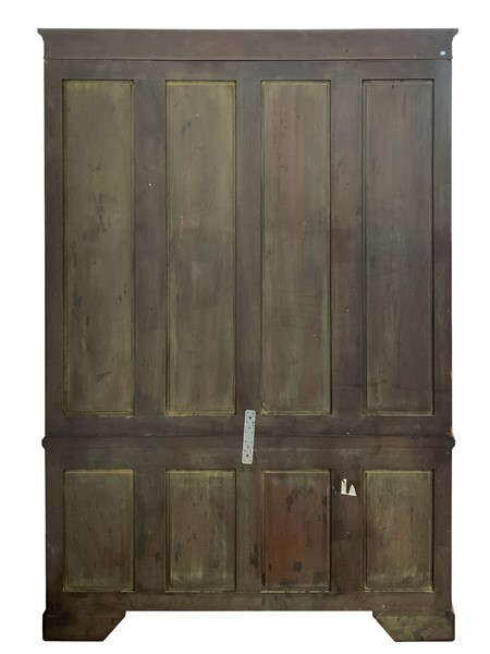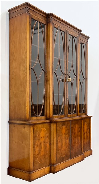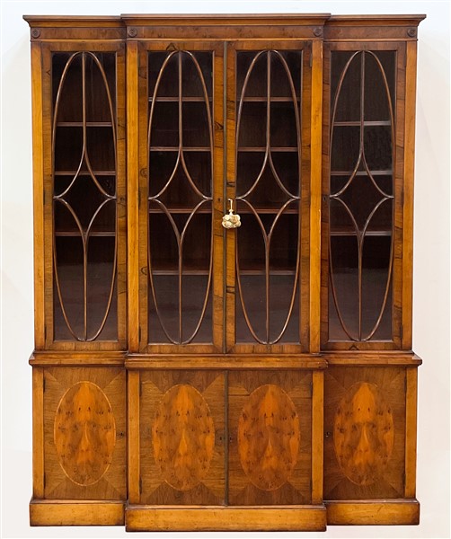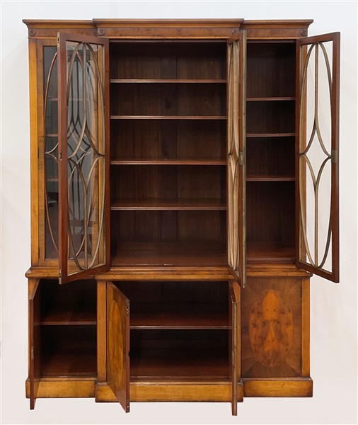 Libreria a due corpi inglese impiallacciata in mogano e filettata in legni vari con parte superiore a quattro ante con vetro, parte inferiore a quattro sportelli centrati da riserve ovali. (cm 160x208x37) (difetti)
