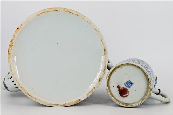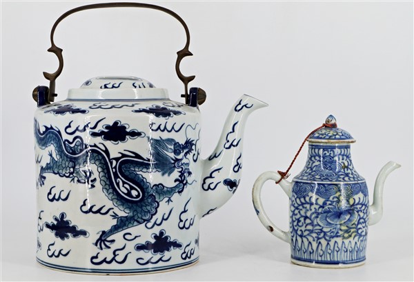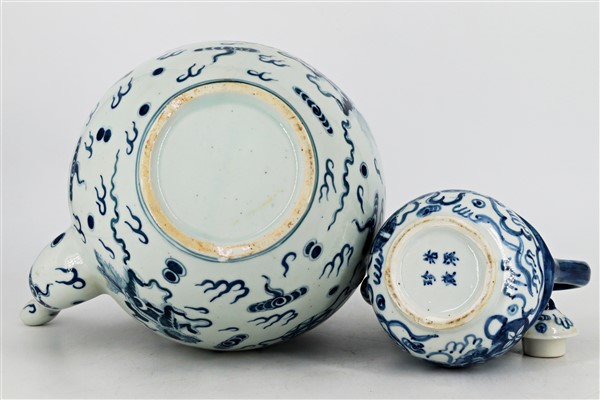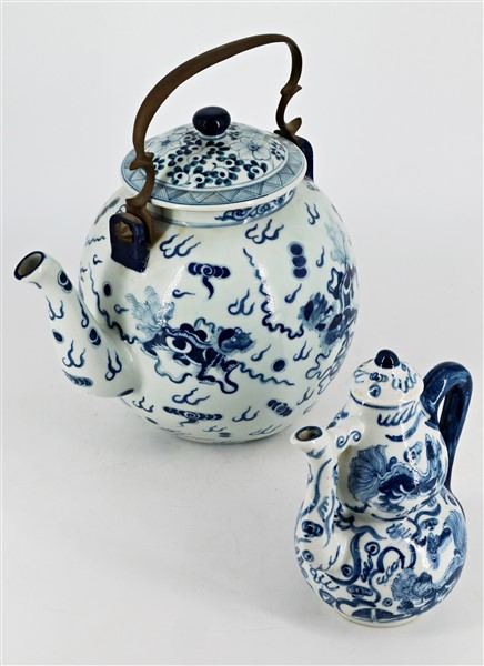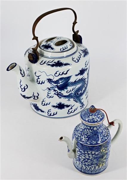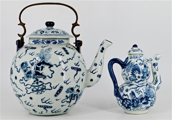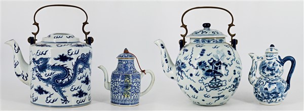 Lotto composto da quattro teiere in porcellana bianca e blu con decori vari Ci