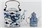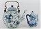 Lotto composto da quattro teiere in porcellana bianca e blu con decori vari