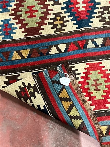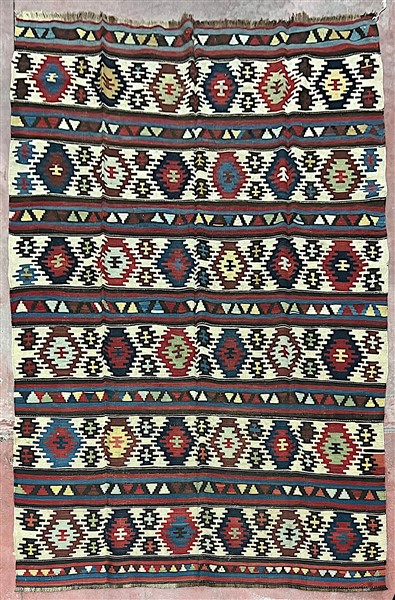 Tappeto Kilim, Caucaso, fine secolo XIX. Decoro a fasce orizzontali a fondo bia