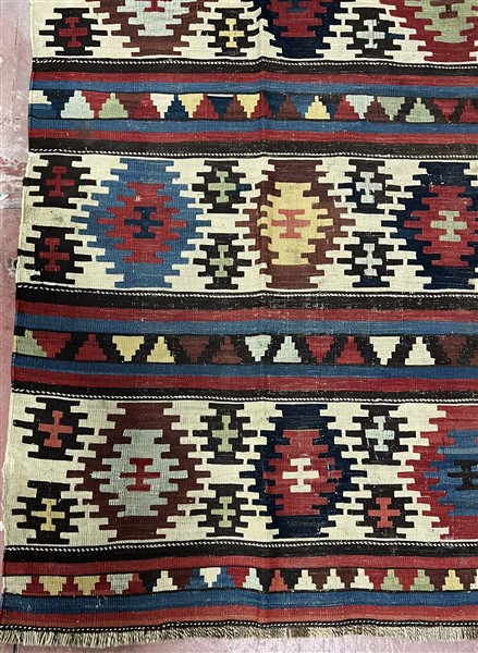 Tappeto Kilim, Caucaso, fine secolo XIX. Decoro a fasce orizzontali a fondo bianco con Memling Gül stilizzati (cm 280x183)
