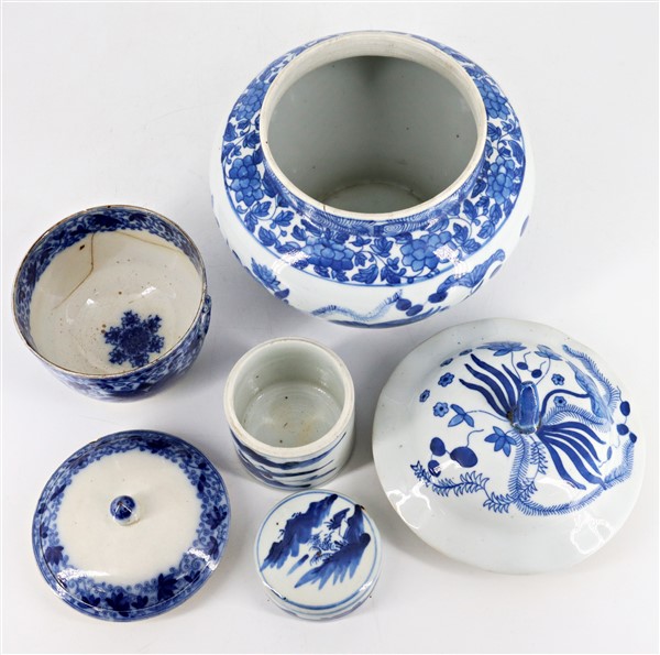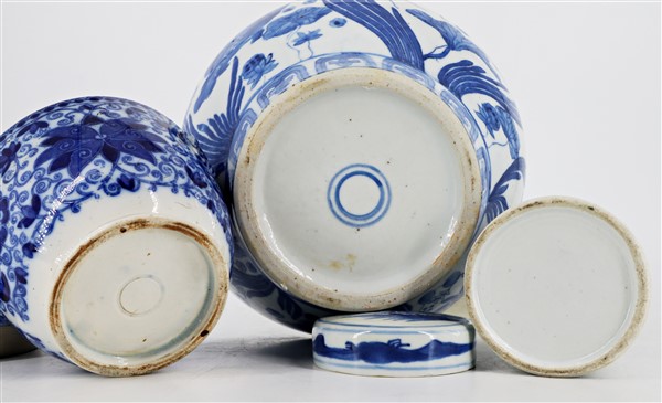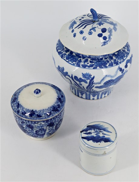 Tre contenitori con coperchio in porcellana bianca e blu con decori vari Cina,