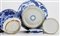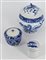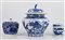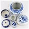 Tre contenitori con coperchio in porcellana bianca e blu con decori vari