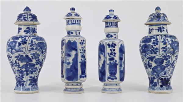 Lotto composto da quattro piccole potiche in porcellana bianca e blu decorate a motivi floreali