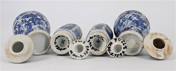 Lotto composto da quattro piccole potiche in porcellana bianca e blu decorate a