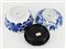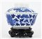 Ciotola in porcellana bianca e blu decorata con motivi floreali con base in legno, insieme a un coperchio non pertinente in porcellana bianca e blu decorato con oggetti preziosi