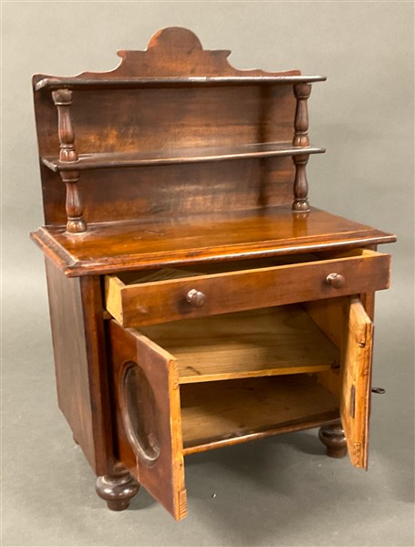 Modello di credenza con parte superiore sagomata a due ripiani con montanti torniti, parte inferiore a un cassetto e due ante riquadrate, piedi torniti. Secolo XIX (cm 32x44x19) (difetti)