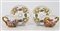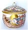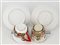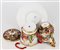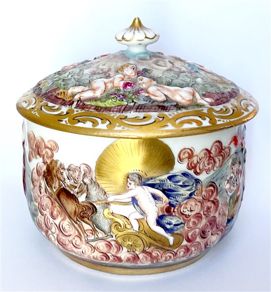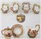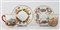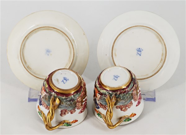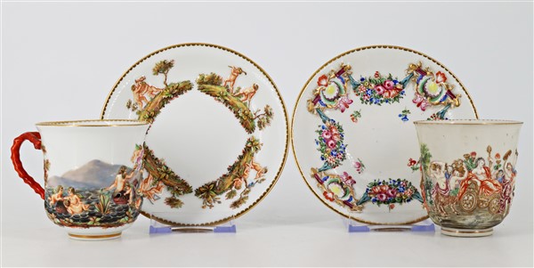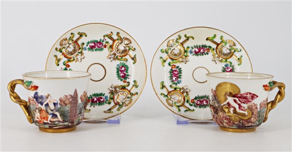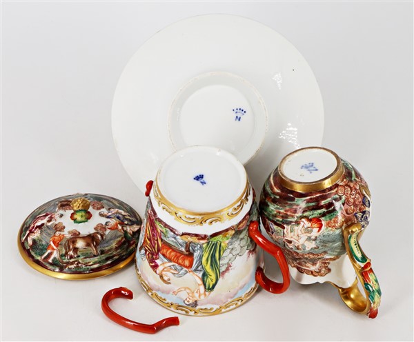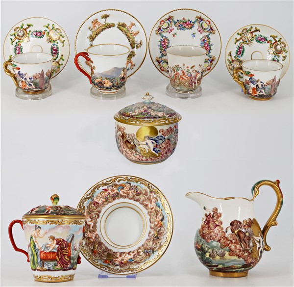 Manifatture diverse, secolo XIX-XX. Lotto composto da cinque diverse tazze con piatto di cui una con coperchio, una zuccheriera e una lattiera in porcellana decorata con figure a rilievo dipinte in policromia con profili in oro. Alcuni pezzi con marca N coronata in blu (h max 13) (difetti e restauri)