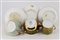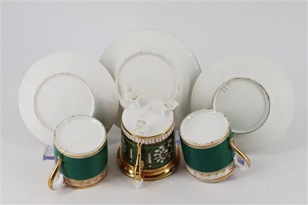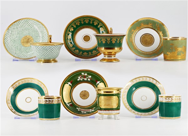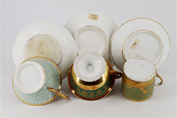 Manifatture diverse, secolo XIX. Lotto composto da sei differenti tazze con piatto in porcellana decorate in oro e verde (d max cm 14) (difetti)