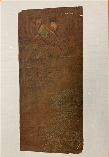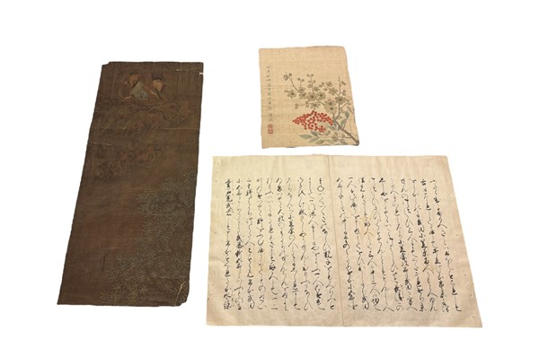 Lotto composto da due dipinti su seta raffiguranti vari soggetti e motibvi floreali ed un disegno con scritte