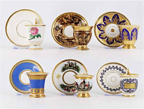 Manifatture diverse, secolo XIX. Lotto composto da sei differenti tazze con pia