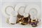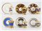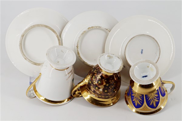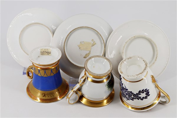 Manifatture diverse, secolo XIX. Lotto composto da sei differenti tazze con piatto in porcellana decorate il policromia con profili in oro (d max cm 14) (difetti)