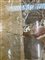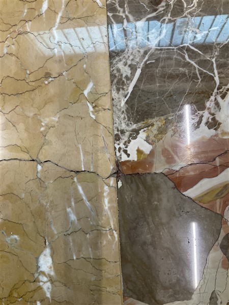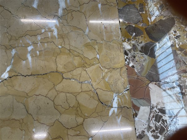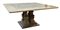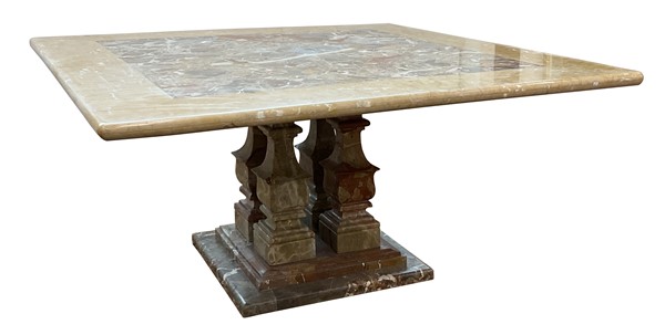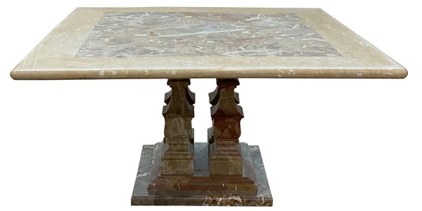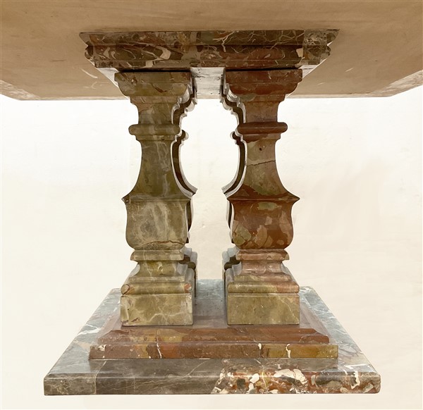 Tavolo con piano quadrato e gambe centrali a balaustro su base gradinata, realizzato con marmi differenti fra cui il Macchiavecchia (cm 150x74x150) (difetti, sbeccature e restauri)