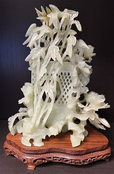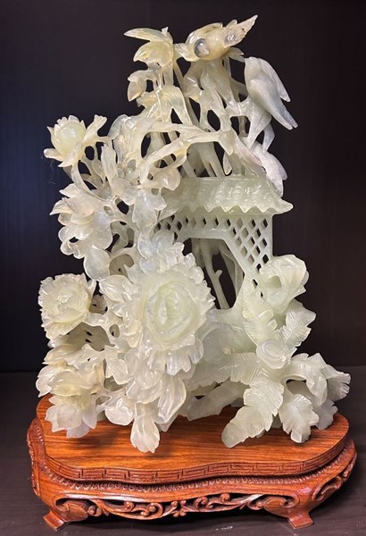 Scultura in pietra verde decorata con motivi floreali e volatili