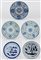 Cinque piattini in porcellana bianca e blu decorati con motivi floreali