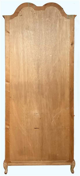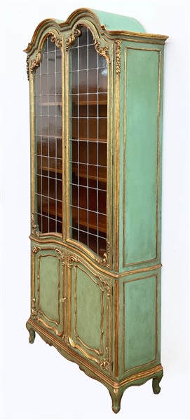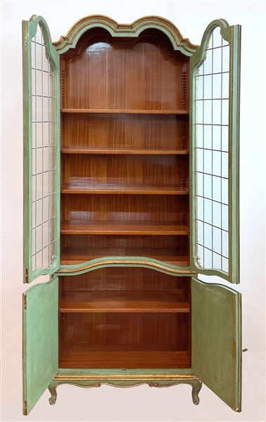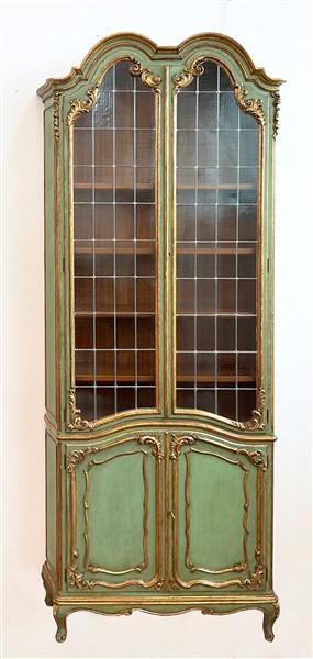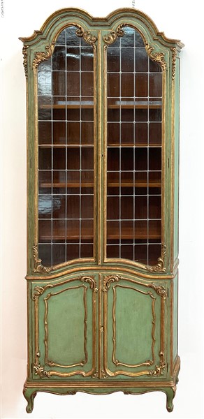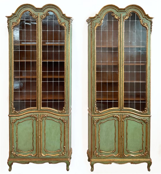 Coppia di librerie in stile settecentesco in legno intagliato e laccato verde con profili dorati. Parte inferiore a due ante sagomate e superiore a due ante con vetri piombati. Piedi mossi (cm 92x250x34) (difetti)