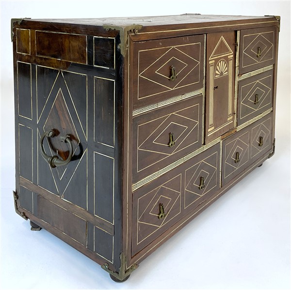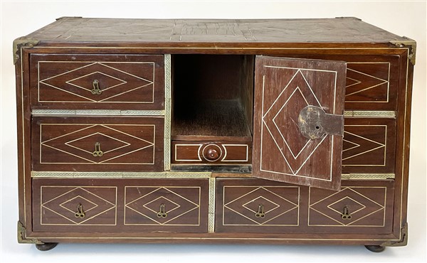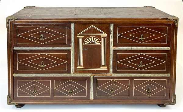 Monetiere impiallacciato in legni vari e filettato in osso a motivi geometrici, fronte a sei diversi cassetti e antina centrale decorata a tempio. Piedi e maniglie laterali in metallo. Secolo XIX (cm 65x40,5x30) (difetti)