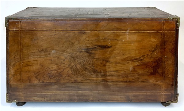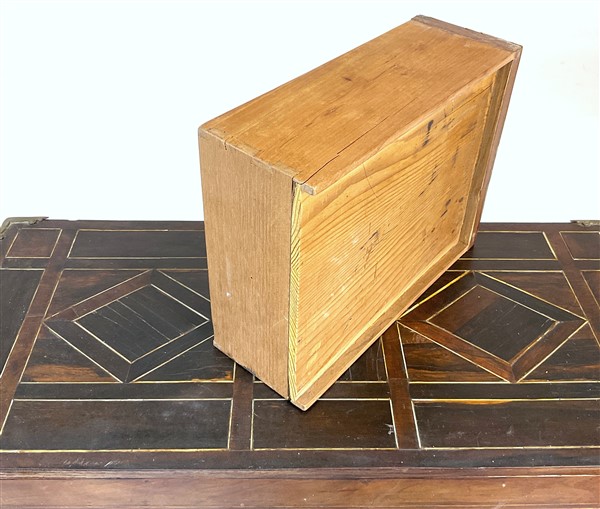 Monetiere impiallacciato in legni vari e filettato in osso a motivi geometrici,