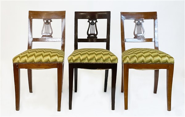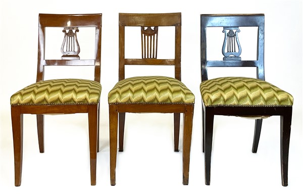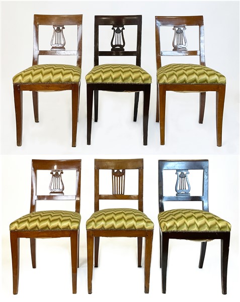 Lotto composto da sei diverse sedie in legno, schienale traforato centrato da elemento a lira (difetti)