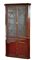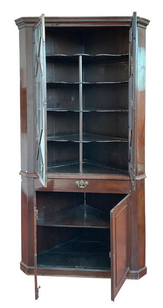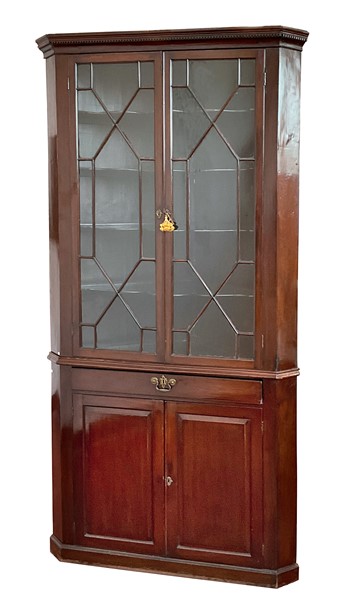 Angoliera a due corpi in mogano con parte inferiore a due sportelli e cassetto, parte superiore a vetrina con ripiani interni sagomati. Inghilterra, secolo XIX (cm 117x226x66) (difetti)