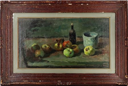 Mario Bucci "Composizione con mele, bottiglia e vaso" olio su tela (cm 30x55) f