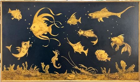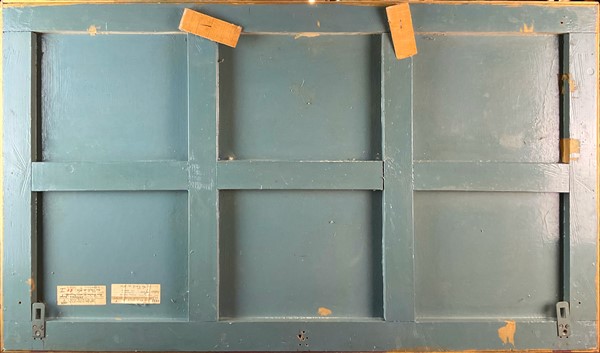 "La port de mer" 1972, tecnica mista su masonite applicata (cm 70x120) firmata e datata in basso a destra; etichette al retro della Societé belge des peintre de la mer