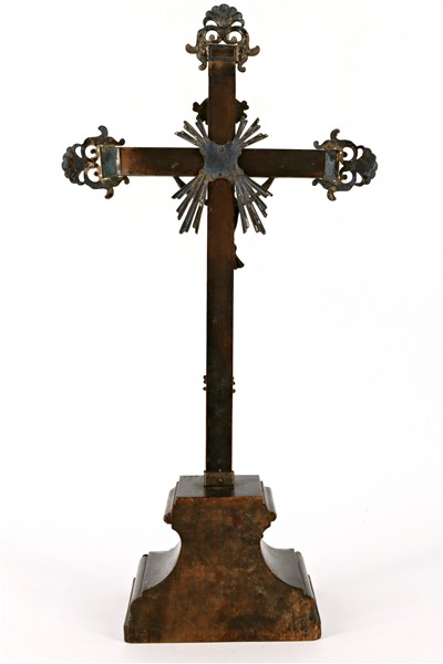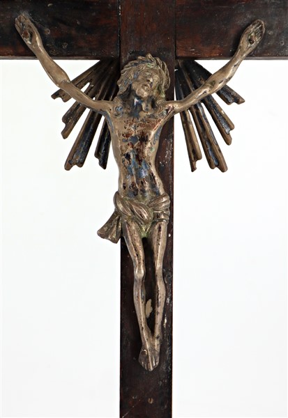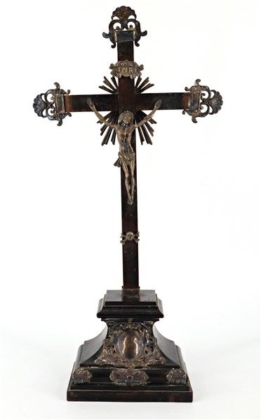 Crocifisso in metallo argentato su croce in legno ebanizzato con fregi a decoro. Secolo XIX (h. totale cm 44) (difetti)