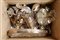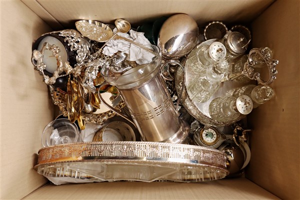 Lotto composto da numerosi oggetti in metallo argentato di usi, forme e decori differenti. In un cartone (difetti)