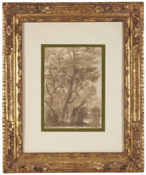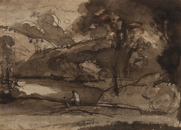 - Anonimo del secolo XIX, "Studio di paesaggio", inchiostro e penna bruna acquerellato in bruno (mm 112x180) in cornice (difetti)