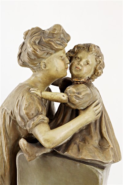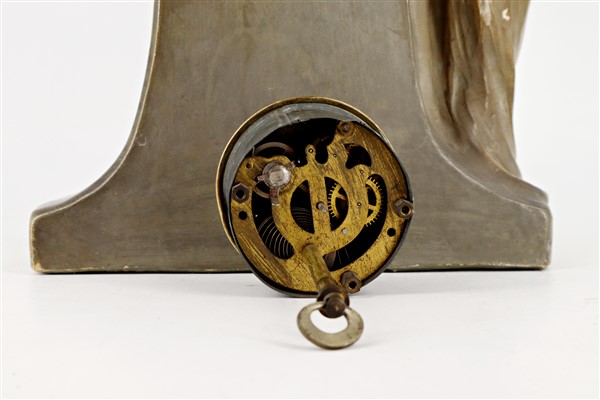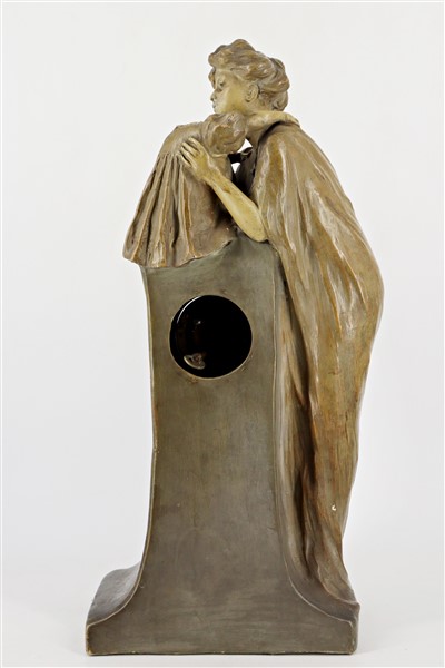 Orologio da appoggio con cassa in gesso raffigurante scena di maternità a tutto tondo. Quadrante a numeri arabi e movimento solo tempo. Inizio secolo XX (h cm 45) (difetti e restauri)