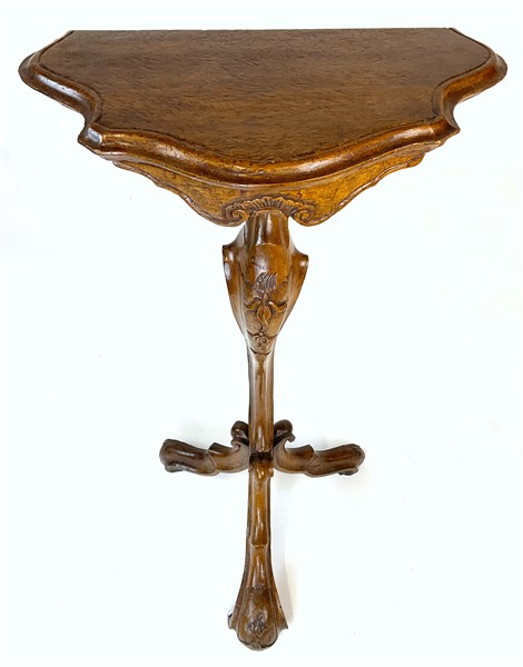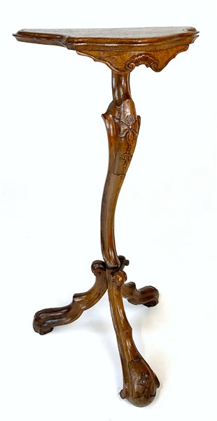 Guéridon in noce intagliato di forma mossa poggiante su base tripode. Veneto, s
