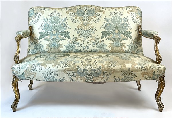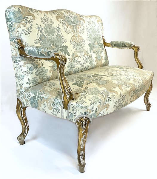 Divano a due posti in legno intagliato e dorato con gambe e braccioli mossi. Se