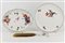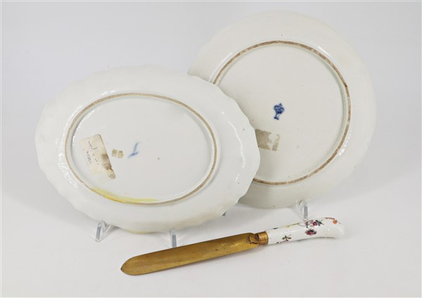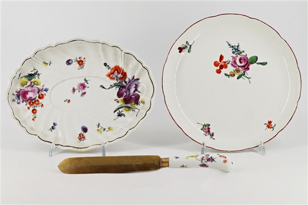 Manifatture diverse, secolo XVIII. Lotto composto un vassoio ovale in porcellana dipinta in policromia a motivo floreale (Fürstenberg) un piatto a profilo polilobato (Ludwigsburg) e un coltello con manico in porcellana (Meissen ?). (d max cm 21) (lievi difetti e restauro)