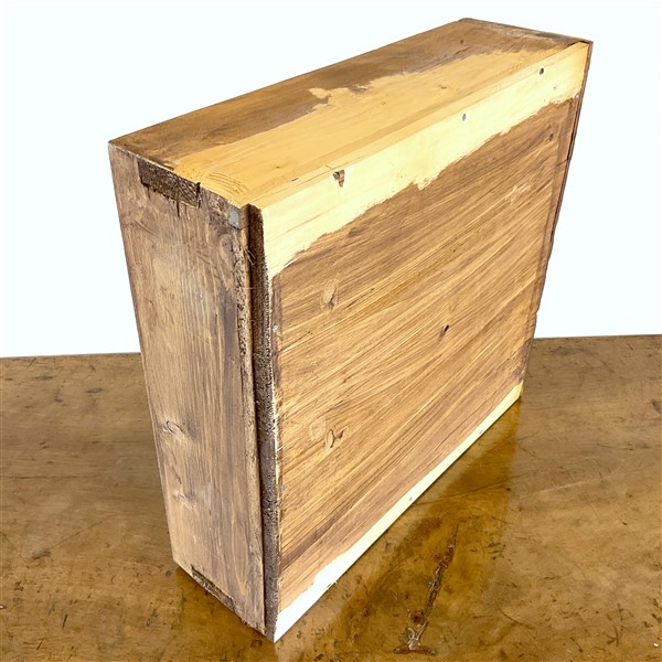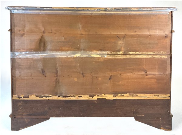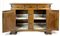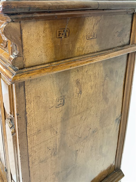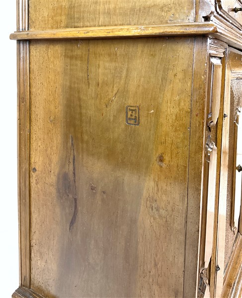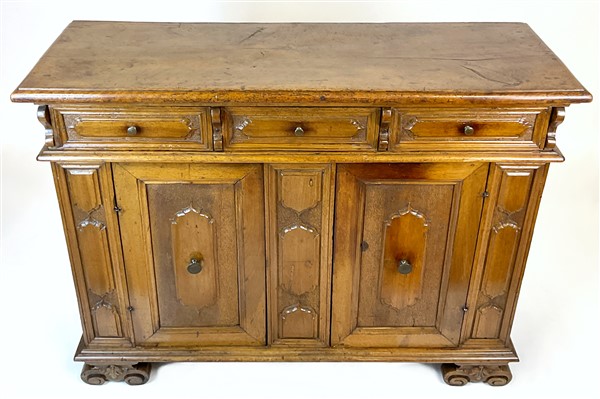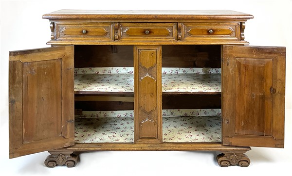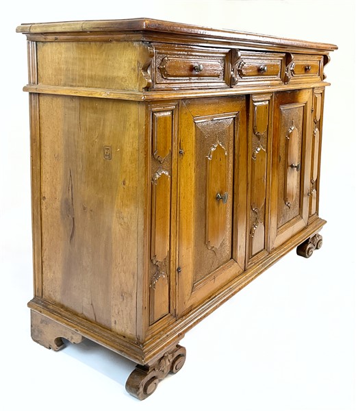 Antica credenza in noce a due ante e tre cassetti con decori a cartelle mistili