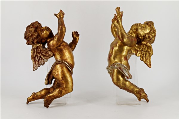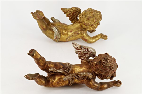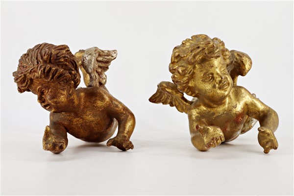 Coppia di angioletti in legno intagliato dorato (l cm 28) (difetti)