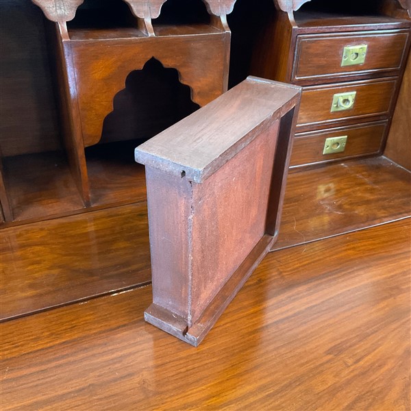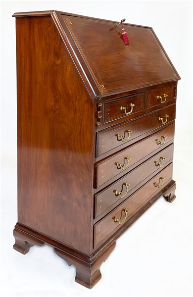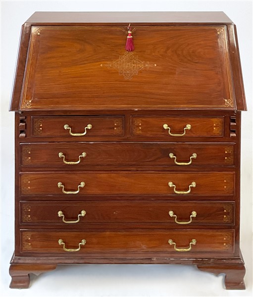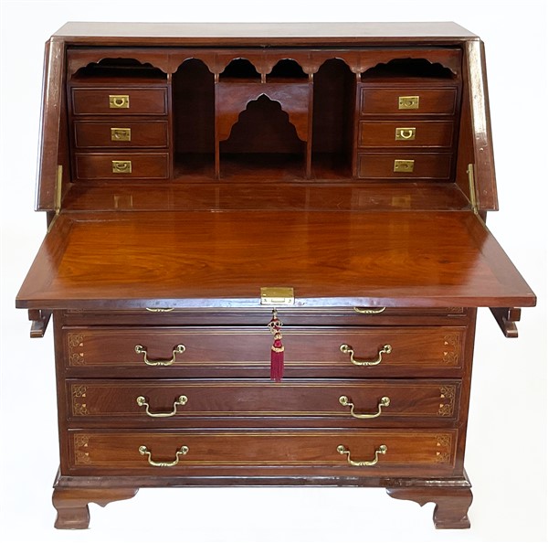 Ribalta Navy in mogano decorata da filettature in ottone, fronte a sei cassetti di cui due allineati e calatoia celante sei tiretti e diversi vani a giorno (cm 92x107x43) (difetti)