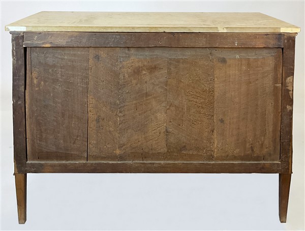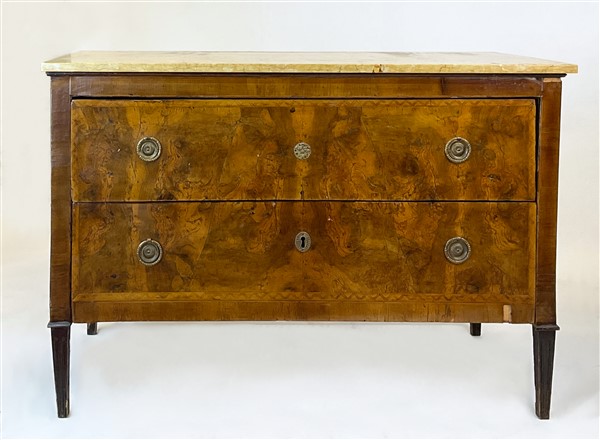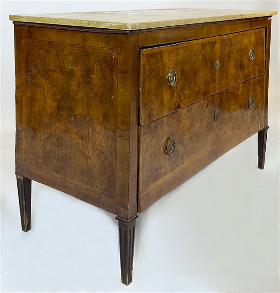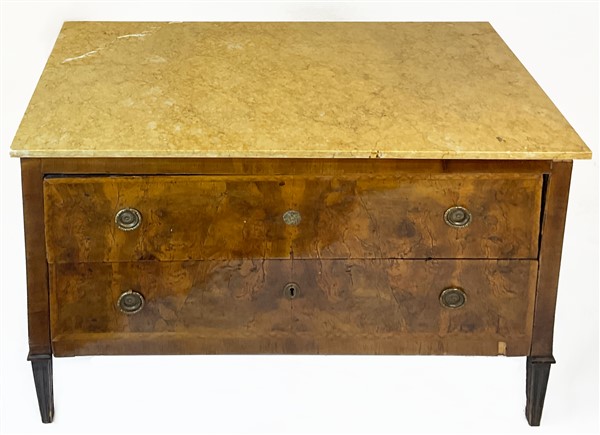 Cassettone impiallacciato in noce e radica di noce con fronte a due cassetti e gambe scanalate. Secolo XIX. Piano in marmo giallo di epoca successiva (cm 119x80x55) (difetti e restauri)