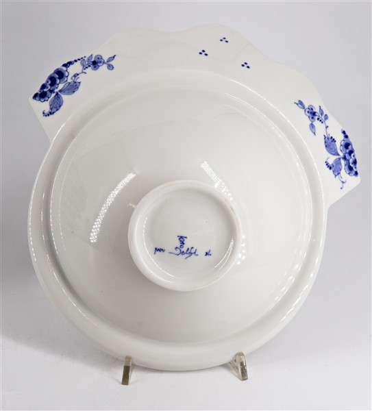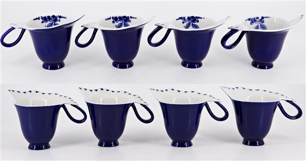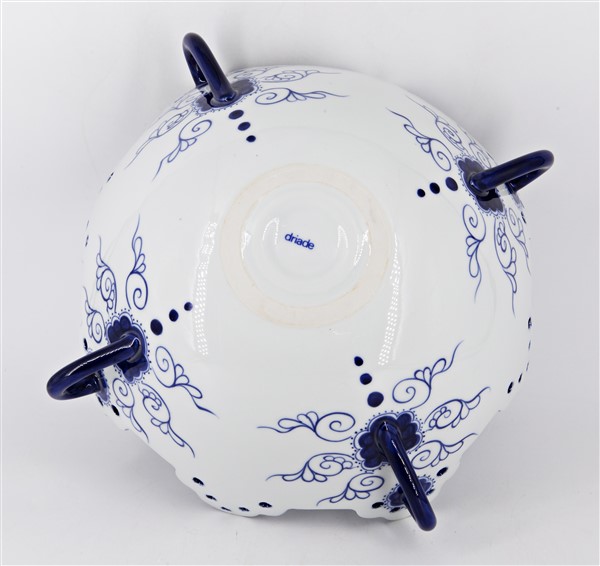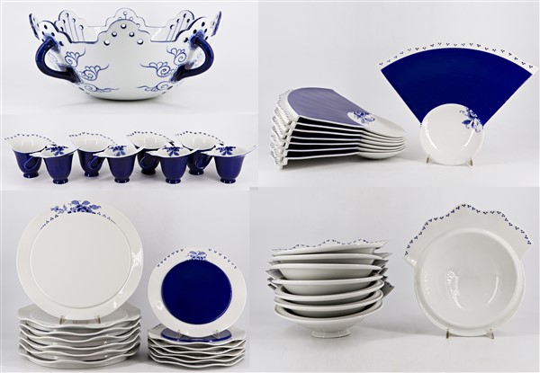 Manifattura di Delft. Parte di servizio da tavola in porcellana decorata in blu composto da sette piatti piani, otto fondine, sette piatti da frutta e otto tazze con sottotazza. Unito ad una fruttiera a quattro anse di simile decoro marcata Driade. In due cartoni (difetti)