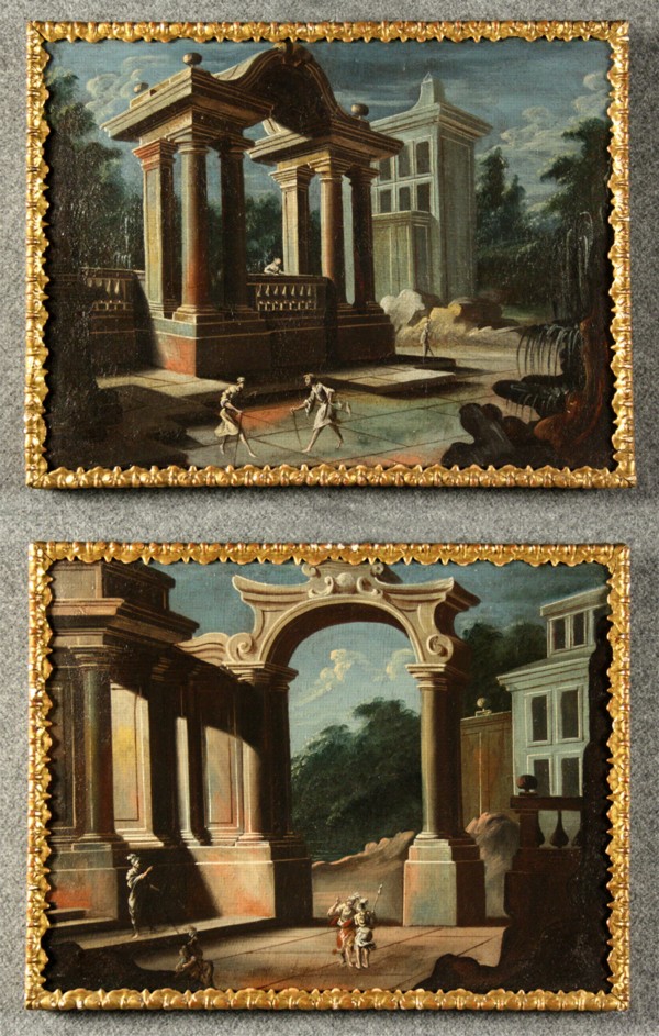 AMBITO DI ANTONIO STOM - Nato nel 1688. Morto a Venezia nel 1734. Coppia di dipinti olio su tela raff. ''CAPRICCI ARCHITETTONICI CON PERSONAGGI''. In cornice. Rintelati e rintelaiati. Mis. Lung. cm. 50 Alt. cm. 40 ca.