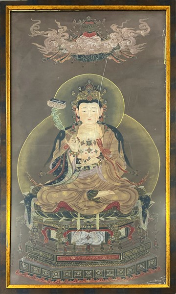 Dipinto su seta raffigurante Guanyin recante firma Ding Guanpeng in cornice
