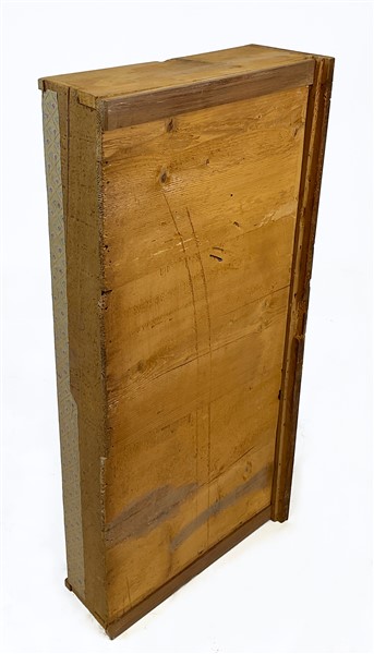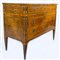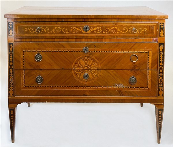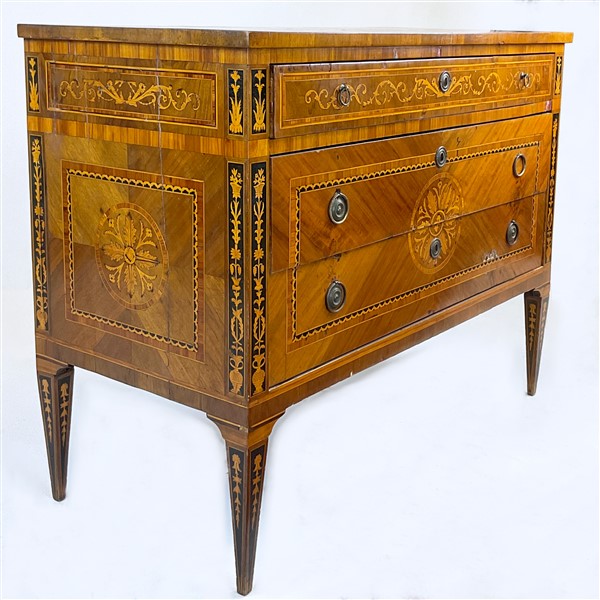Cassettone lastronato e intarsiato in legni di varie essenze, fronte a due cass