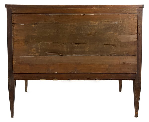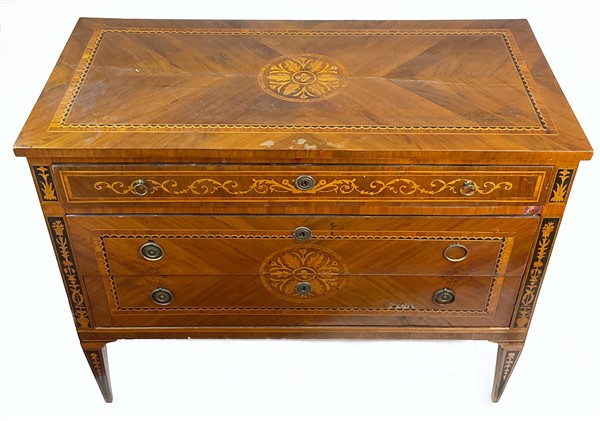 Cassettone lastronato e intarsiato in legni di varie essenze, fronte a due cassetti e uno a mezza altezza, gambe ad obelisco rovesciato, decoro a rosoni entro riserve e candelabra su fondo ebanizzato. Lombardia, secolo XIX. (cm 107,5x85x51,5) (difetti e restauri)