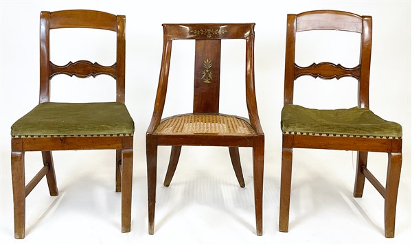 Lotto composto da coppia di sedie in noce e una sedia a gondola in mogano intar