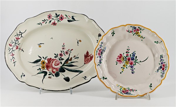 Manifattura di Faenza, secolo XVIII. Lotto composto da un vassoio ovale e un pi