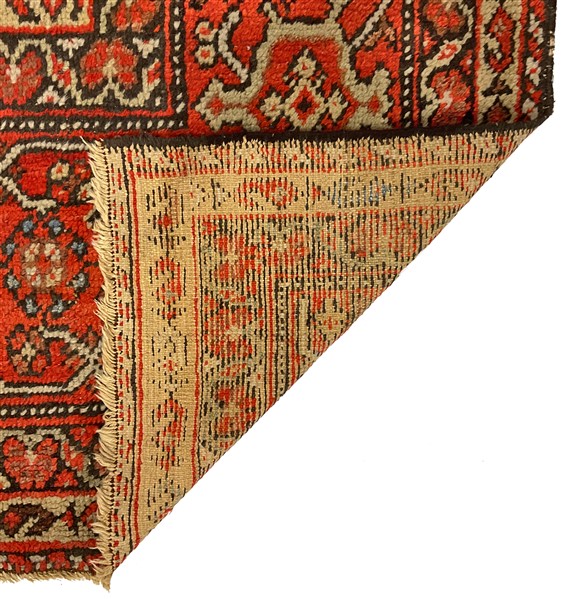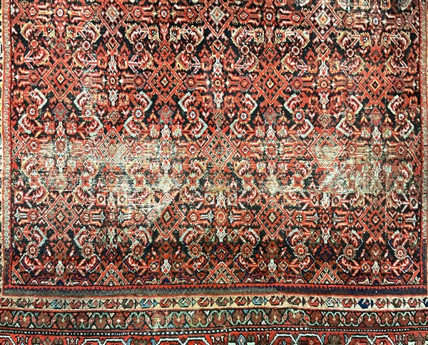 Tappeto Ferahkan, Persia, inizio secolo XX. Decoro Herati su fondo marrone scuro (cm 434x319) (difetti e rapature)