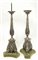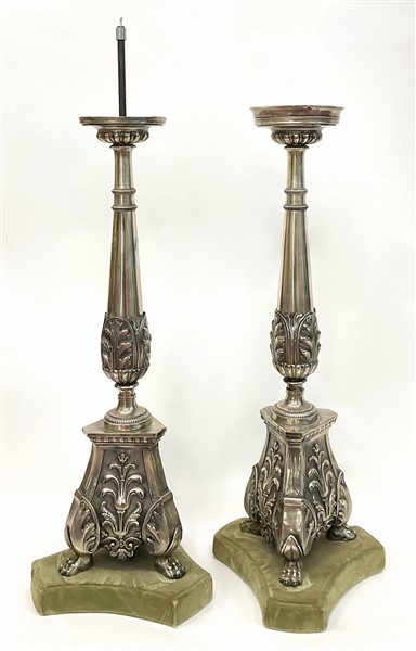 Coppia di candelieri in metallo argentato e cesellato con decoro a volute fogliate, sostegno tripode con piedi a zampe ferine, su base rivestita in velluto verde (h. tot cm 76) adattati a lampada (difetti e mancanze)