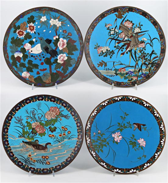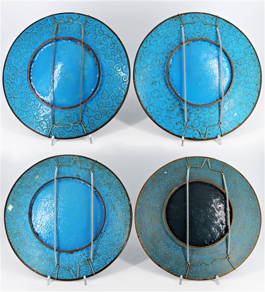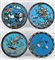 Quattro piatti in smalto cloisonnè decorati con motivi floreali