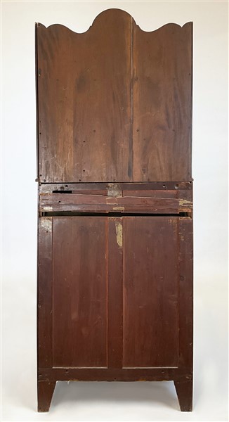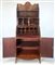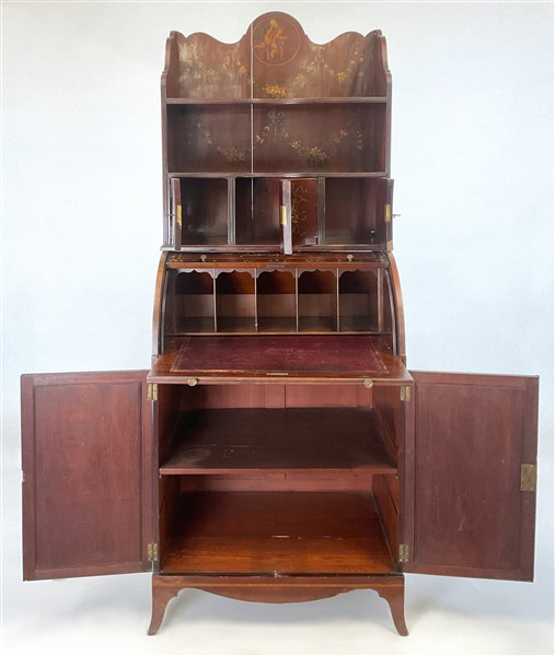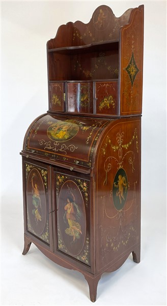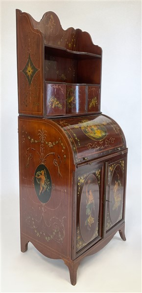 Mobile a due corpi in stile Sheradon in mogano e filettato, interamente dipinto in policromia con scene allegoriche, putti, trofei e festoni fioriti. Parte inferiore a due ante e ribalta a rullo celante diversi scoparti, parte superiore a tre ante e due ripiani con cimasa sagomata. Stampigliatura sul bordo di un'anta "John Watson - Oxford street" (cm 68x180x53) (difetti)