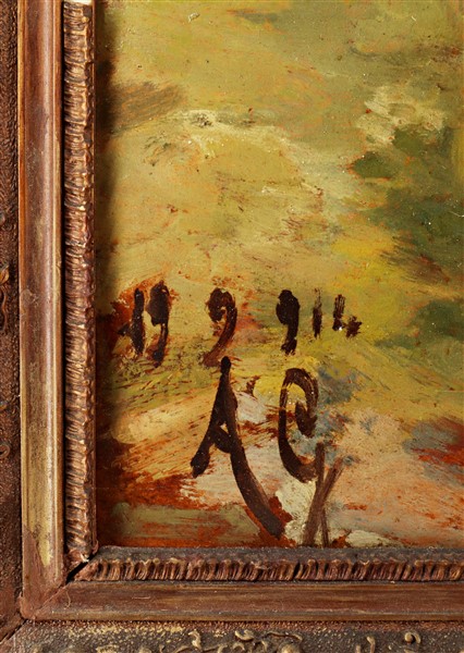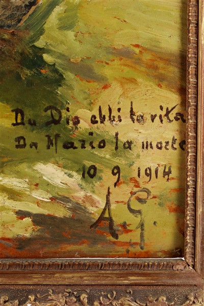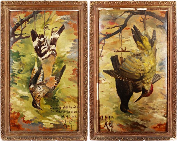 Ignoto del secolo XX, Lotto composto da due dipinti ad olio su cartone raffiguranti Cacciagione, monogrammati "A. G." e datati in basso. uno dedicato (cm 50x28,5)