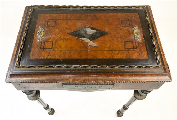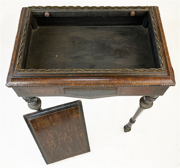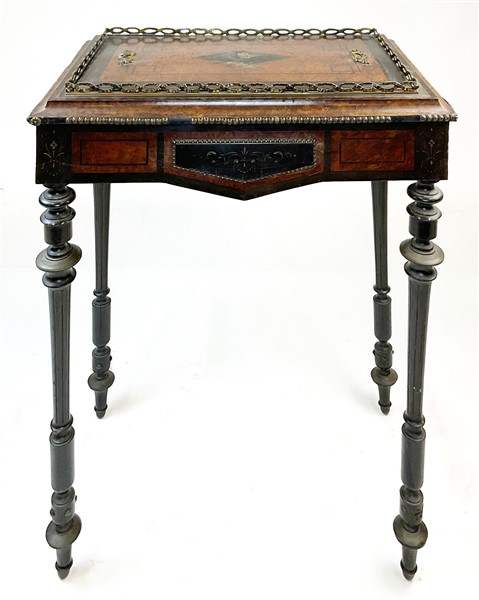 Fioriera impiallacciata in radica e legno ebanizzato con gambe scanalate e tornite, ringhierina e bordure in metallo dorato (cm 60x81x39) (gravi difetti)